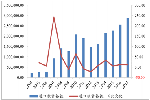 我國不銹鋼粗鋼產(chǎn)量逐年攀升,需求持續(xù)增長,我國對鉻礦需求預(yù)期將持續(xù)上升,2017年我國鉻礦進口數(shù)量達(dá)13,865,021.72噸,同比增長31.10%,鉻鐵進口數(shù)量達(dá)2,873,496.35噸,同比增加12.30%。